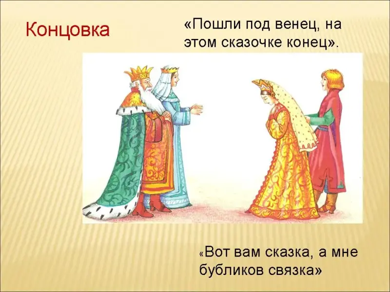 Учитель: Вспомните концовки сказок ("Пошли под венец, на этом сказочке конец", "Вот вам сказка, а мне бубликов связка")