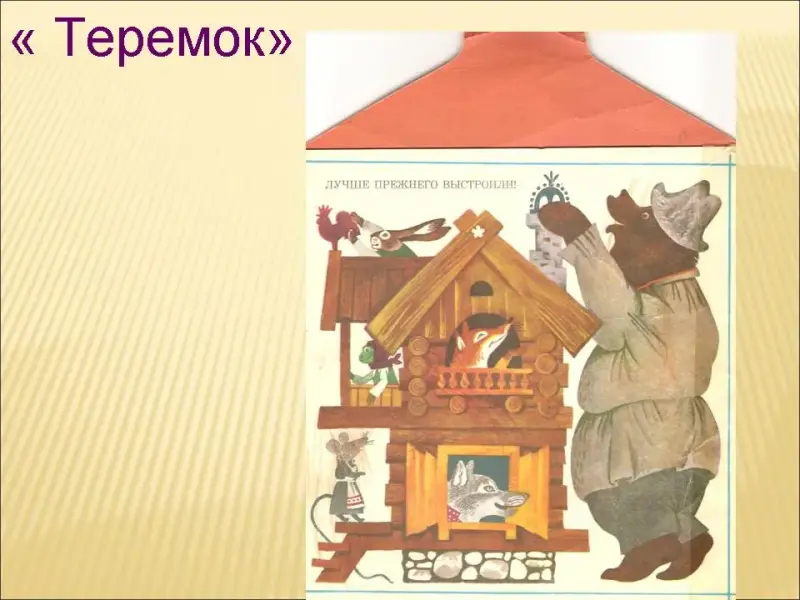 1. Назовите героев сказок Маршака "Теремок" (мышь, лягушонок, ежик, лиса, волк, медведь).
