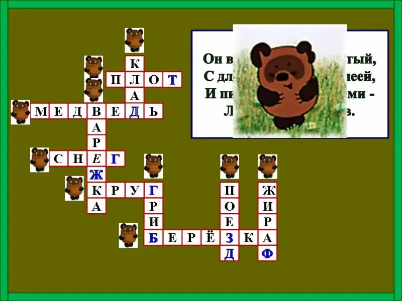 Учитель: (Слайд 9) Вини-Пуху почтальон принес письмо. От кого это письмо Вини-Пух не знает. Однако в конверте оказался кроссворд, который поможет узнать, кто же автор письма. Вини-Пух просит вашей помощи в разгадывании кроссворда. Поможем ему?