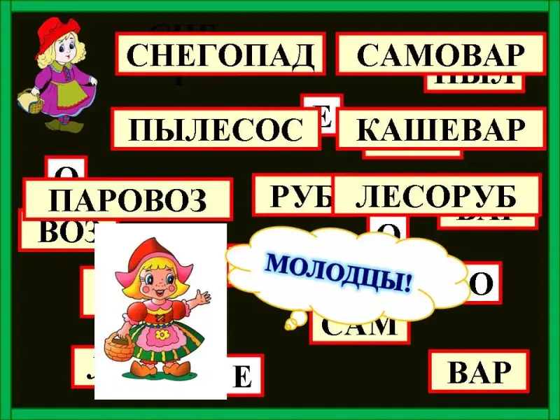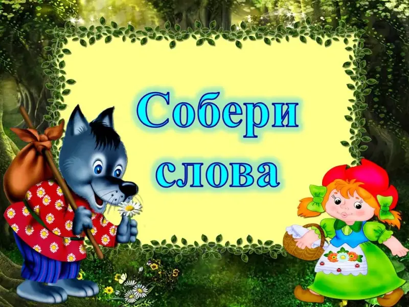 Учитель: (Слайд 14) А тем временем мы встретили на своем пути известных сказочных героев Красную Шапочку и Серого волка. Они предлагают вам собрать слова.