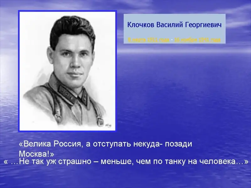 Политрук роты Василий Клочков сказал бойцам: "Не так уж страшно - меньше чем по танку на человека". Гранатами, бутылками с горючей смесью и огнем из противотанковых ружей отважные панфиловцы подбили 14 танков. Остальные повернули назад.