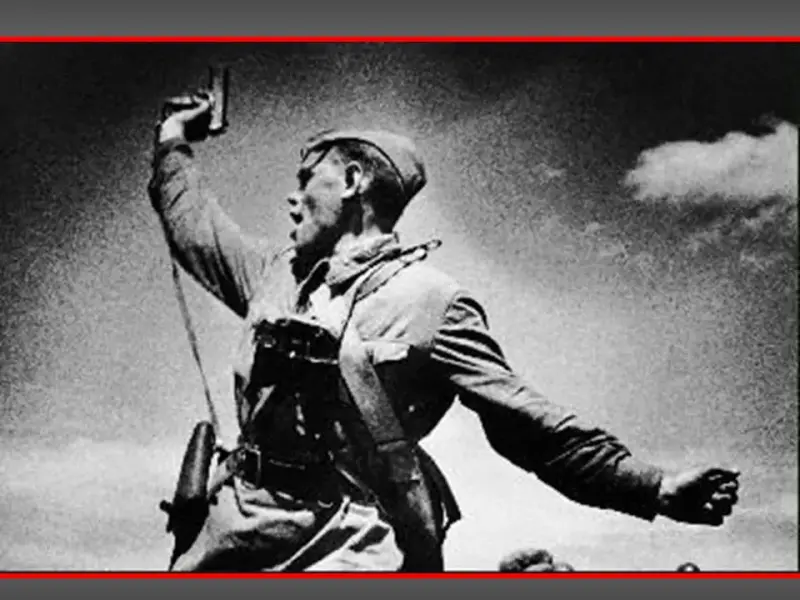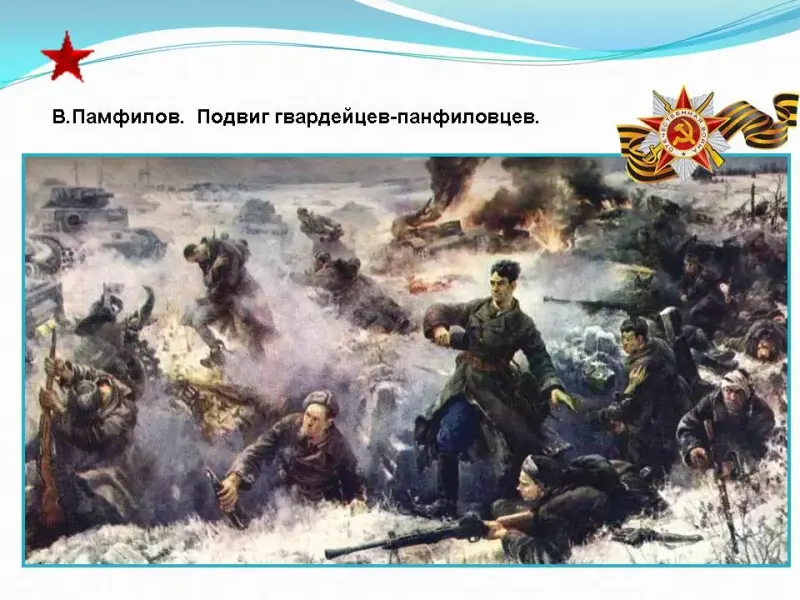 (щелок мышкой) Политрук В.Г. Клочков обратился к бойцам со словами, которые впоследствии навсегда вошли в историю: "Велика Россия, а отступать некуда - позади Москва!" Панфиловцы поклялись: "Ни шагу назад!" Один за другим в жестоком бою воины выбывали из стоя. Тяжело раненый политрук со связкой гранат бросился под вражеский танк и взорвал его. Четыре часа длился этот легендарный бой. 18 танков и десятки солдат потерял здесь враг, но прорвать оборону ему так и не удалось.