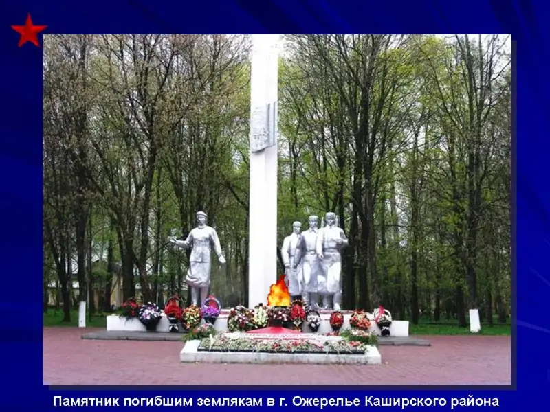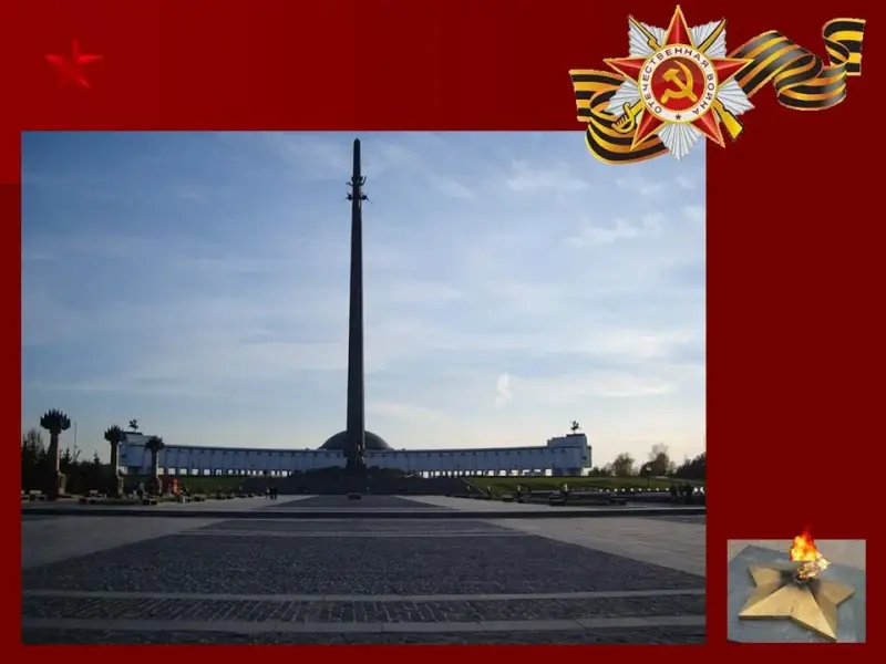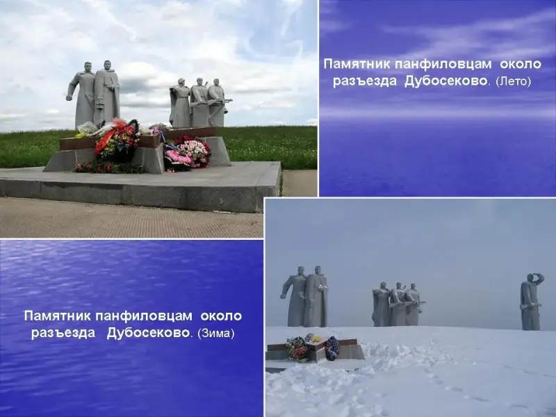 Чтец. В дни празднования 30-летия Победы у разъезда Дубосеково был открыт величественный мемориальный комплекс - народ увековечил подвиг 28 героев - панфиловцев. Над ратным полем во весь рост с оружием в руках встали высеченные из камня фигуры воинов. Их лица обращены в сторону, откуда лавиной шли фашистские танки. За спинами бойцов - Москва, которую они защищали ценой собственной жизни.