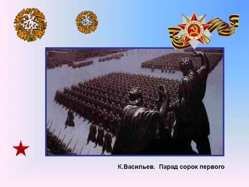 (Слайд 9-21 (автоматически). Звучит фрагмент песни "Вставай, страна огромная…"