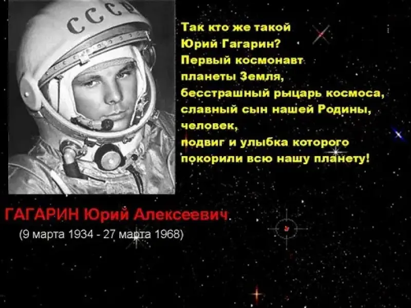 ВЕДУЩИЙ: Так кто же такой Юрий Гагарин - первый космонавт планета Земля, бесстрашный рыцарь космоса, славный сын нашей Родины, человек, подвиг и улыбка которого покорили всю нашу планету?