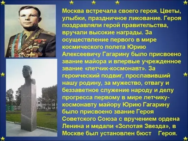 ВЕДУЩИЙ: Москва встречала своего героя. Цветы, улыбки, праздничное ликование. Героя поздравляли герой правительства, вручали высокие награды. За осуществление первого в мире космического полета Юрию Алексеевичу Гагарину было присвоено звание майора и впервые учрежденное звание "летчик-космонавт". За героический подвиг, прославивший нашу родину, за мужество, отвагу и беззаветное служение народу и делу прогресса первому в мире летчику-космонавту майору Юрию Гагарину было присвоено звание Героя Советского Союза с вручением ордена Ленина и медали "Золотая Звезда", в Москве был установлен бюст Героя. А потом были многочисленные поездки по зарубежным странам. Всему миру стала известна его улыбка.