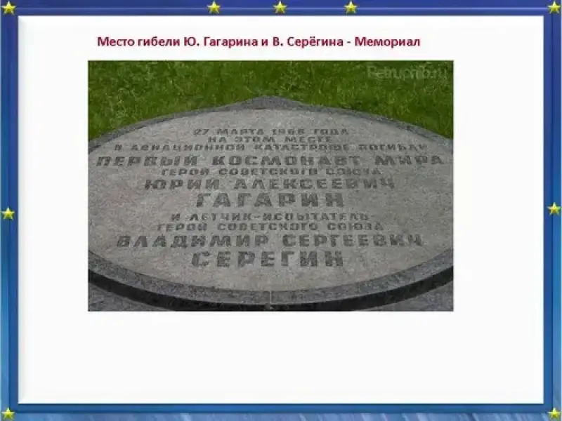 (Cлайд 25,26) На месте трагической гибели Ю.А. Гагарина и В.С. Серегина сооружен мемориал, в центре его - стела из красного камня, на которой в барельефном изображении - портреты погибших. Зимой и летом идут сюда люди, чтобы минутой скорбного молчания почтить память героев, приезжают их родные и близкие, российские и зарубежные космонавты.