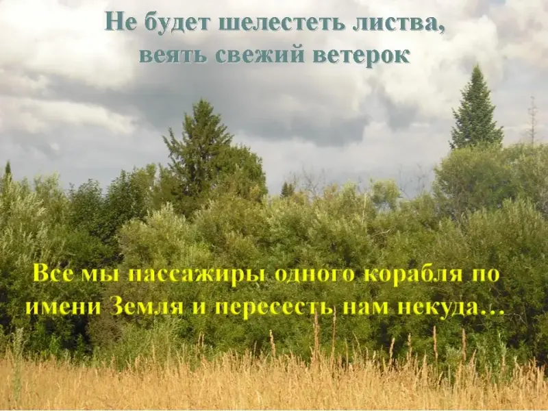 Начиная со 2 половины ХХ века, и особенно в ХХ1веке, вторжение человечества в биосферу стало настолько мощным, что природа практически исчерпала свои восстановительные способности. А человек все продолжает и продолжает действовать, интуитивно надеясь, что планета сможет восполнить нанесенный ей ущерб, и снова будет шелестеть листва и веять свежий ветерок. Не будет. (Cлайд 12)