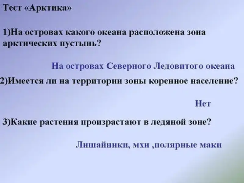 1) На островах, какого океана расположена зона арктических пустынь? (на островах Северного Ледовитого океана)