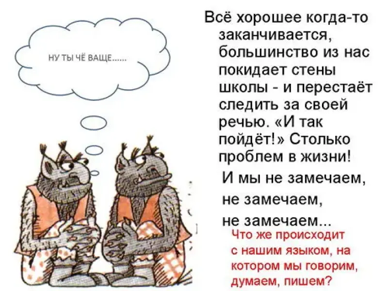 Мы нанизываем на свою тему всё то, что ещё никто не совместил, а мы считаем необходимым - время пришло! - совмещение именно этих фактов, этих явлений состояния нашего языка. Презентация-коллаж состоит из 5 картин. И хотя названия картин напоминают лубок, проблемы затронем самые серьёзные.
