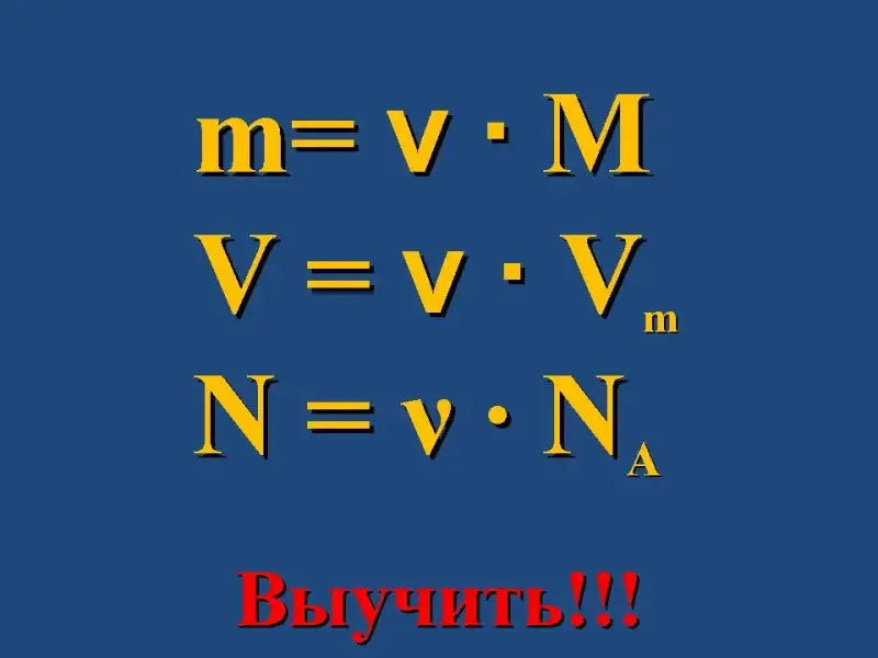 - Знакомство с формулами, показывающими взаимосвязь: объема, молярного объёма и количества вещества; числа частиц, числа Авогадро и количества вещества.
