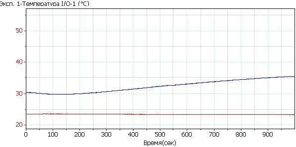 График 1. Зависимость транспирации и температуры от площади поверхности листьев (2 листа) Красным обозначена влажность, синим температура.