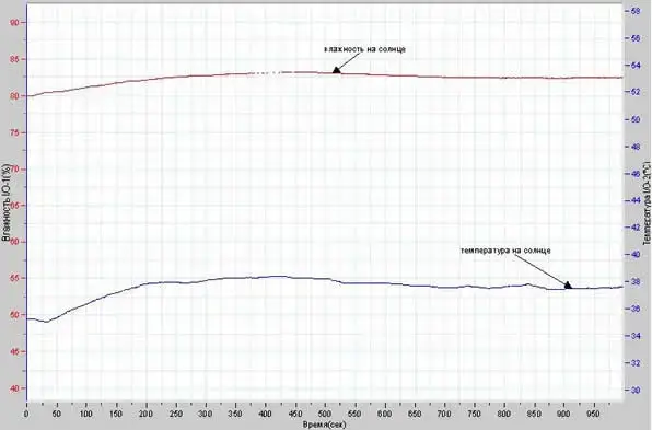 | Время (с) | Температура около растения в тени (°C) | Температура около растения на солнце (°C) | Влажность воздуха около растения в тени (%) | Влажность воздуха около растения на солнце (%) |