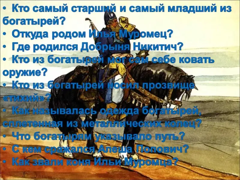 - 6 Кто из богатырей носил прозвище "тихий"? (Добрыня Никитич)
