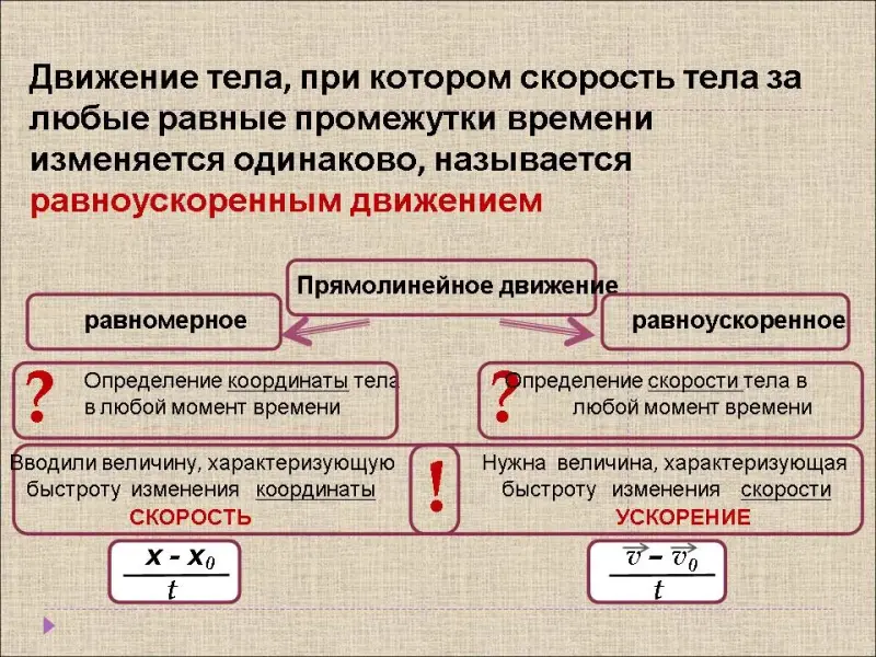 Акцентируется внимание еще раз на том факте, что при изучении равномерного движения мы вводили величину, которая характеризующую быстроту изменения координаты, которая называлась "скорость", а для равноускоренного движения, с которым мы познакомились на предыдущем уроке, необходима величина, которая бы характеризовала быстроту изменения скорости - "ускорение"