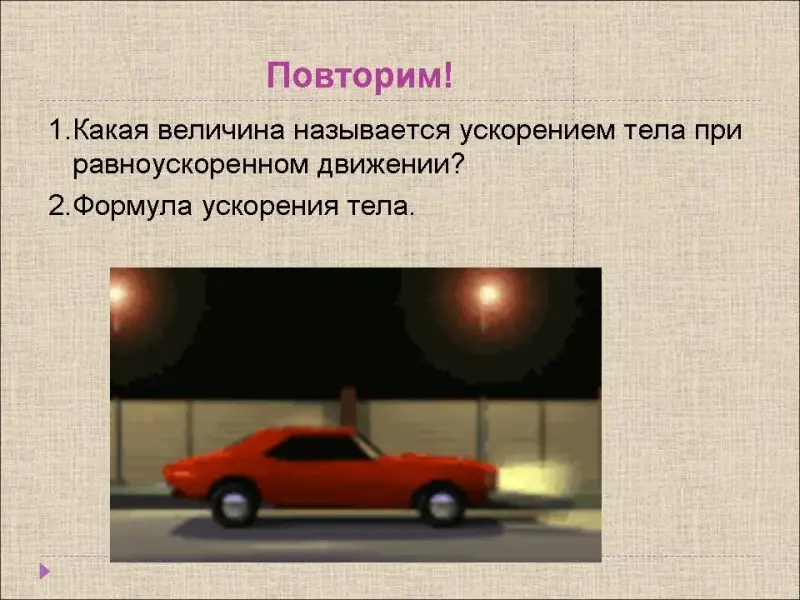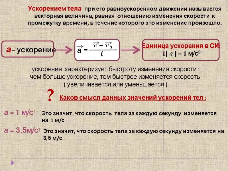 Дается определение ускорения, формула для расчета ускорения, единица в СИ, физический смысл величины и рассматриваются 2 примера на закрепление физического смысла ускорения.