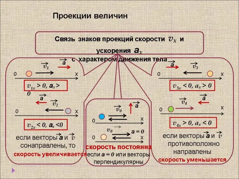 Отработка умения видеть, как изменяется числовое значение скорости тела, в зависимости от направления векторов скорости и ускорения и знаков их проекции.
