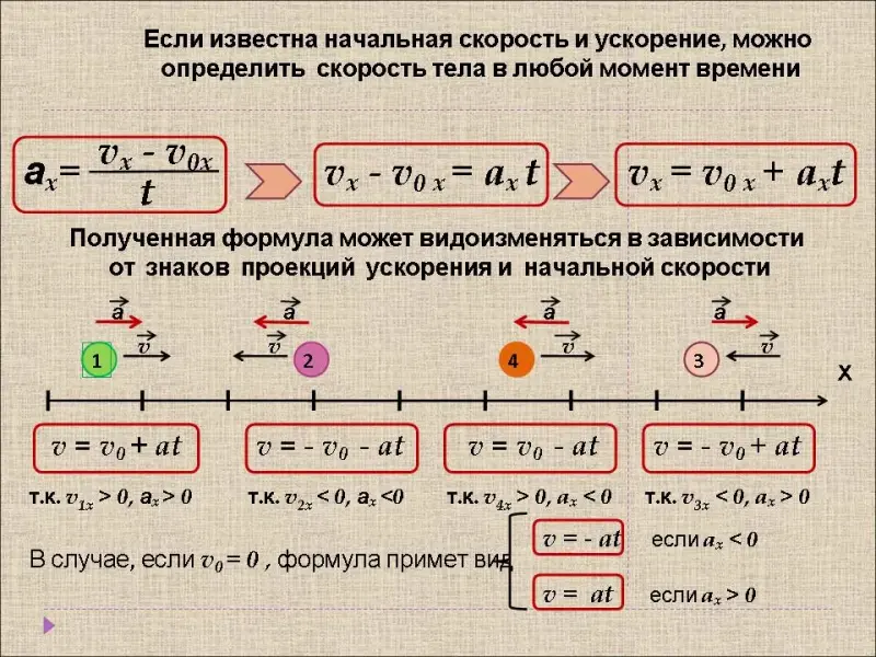 Вывод формулы проекции скорости тела в любой момент времени. Повторение зависимости вида полученной формулы от знаков проекций векторных величин, входящих в формулу.