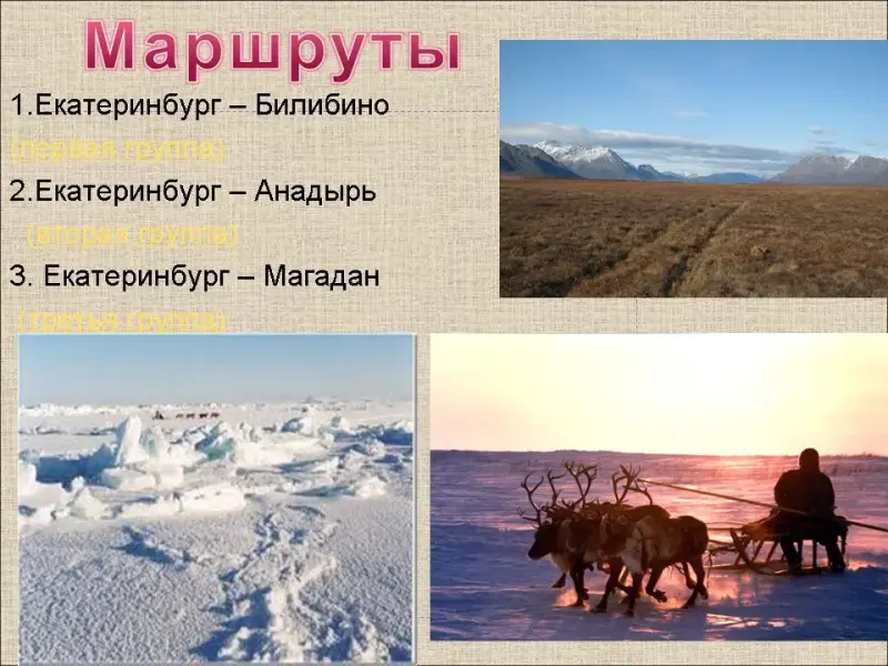 Тематика задач посвящена Крайнему Северу - краю Белого Безмолвия, красивейших природных явлений. Давайте представим, что вы собираетесь посетить Чукотку. Обратимся к карте России. Из Екатеринбурга на Чукотку можно попасть авиатранспортом. Мы выбираем три маршрута: Екатеринбург - Билибино, Екатеринбург - Анадырь, Екатеринбург - Магадан.