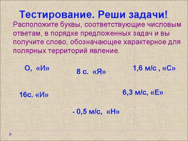 Расположить буквы, соответствующие числовым ответам, в порядке предложенных задач и получить слово, обозначающее характерное для полярных территорий явление. Учащиеся выполняют тест. Учащиеся оценивают свою работу.