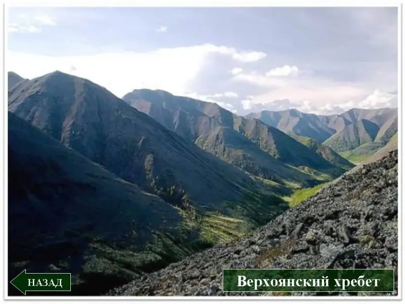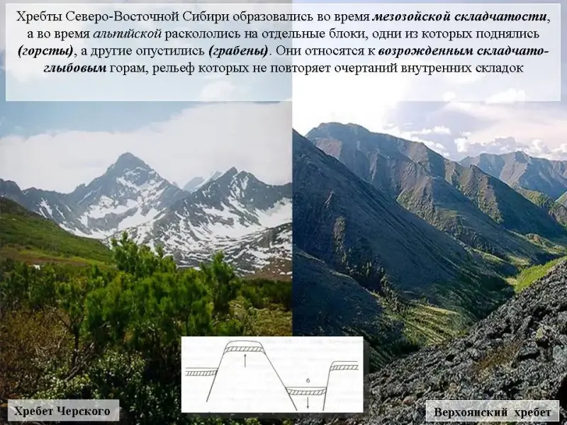 Слайд 18. Хребты Северо-Восточной Сибири образовались во время мезозойской складчатости, а во время альпийской раскололись на отдельные блоки, одни из которых поднялись (горсты), а другие опустились (грабены). Они относятся к возрожденным складчато-глыбовым горам, рельеф которых не повторяет очертания внутренних складок.
