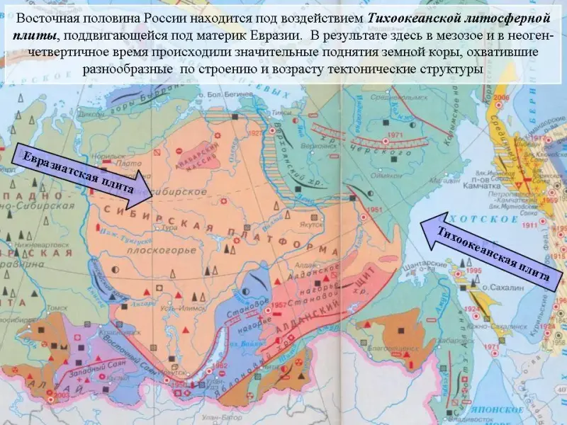 Слайд 12. Восточная половина России находится под воздействием Тихоокеанской литосферной плиты, поддвигающейся под материк Евразии. В результате здесь в мезозое и в неоген-четвертичное время происходили значительные поднятия земной коры, охватившие самые разнообразные по строению и возрасту тектонические структуры (работа с тектонической картой по определению особенностей строения территории, перечисление тектонических структур).