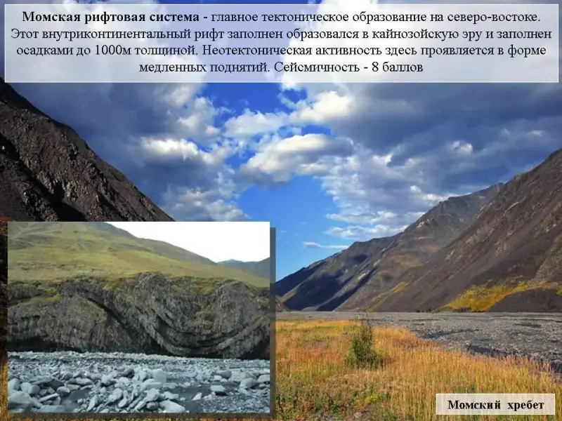 Слайд 13. Кайнозойская Момская рифтовая система - главное тектоническое образование на северо-востоке. Этот внутриконтинентальный рифт заполнен осадками до 1000 м толщиной и ограничен хребтом Черского на юго-западе и Момским хребтом на северо-востоке. Неотектоническая активность проявляется в форме медленных поднятий. Сейсмичность - 8 баллов.
