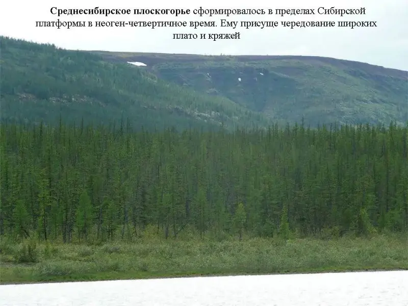 Слайд 14. Среднесибирское плоскогорье сформировалось в пределах Сибирской платформы в неоген-четвертичное время. Ему присуще чередование широких плато и кряжей.