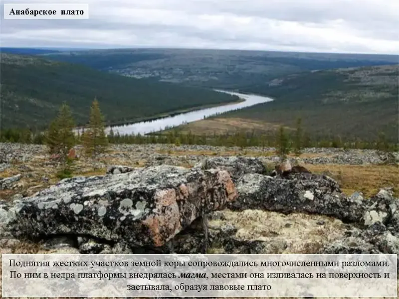 Слайд 15. Поднятия жестких участков земной коры сопровождались многочисленными разломами. По разломам в недра платформы внедрялись магматические массы, местами они изливались на поверхность. Излившаяся магма застывала, образовав лавовые плато.