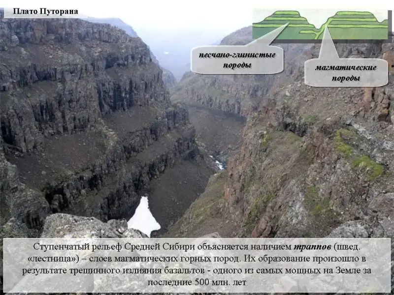 Слайд 16. Ступенчатый рельеф Средней Сибири объясняется наличием траппов (швед. "лестница") - слоев магматических горных пород. Их образование произошло в результате трещинного излияния базальтов - одного из самых мощных на Земле за последние 500 млн. лет.