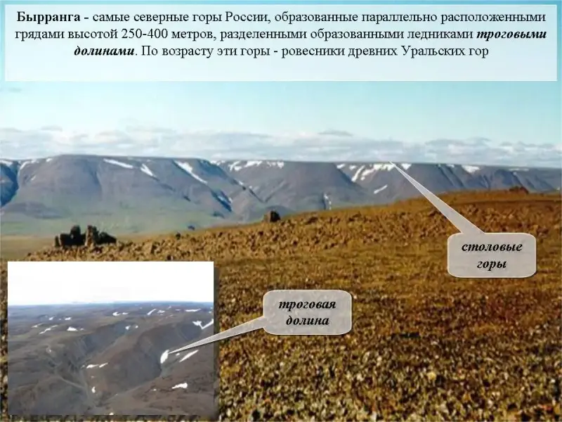Слайд 19. Бырранга - самые северные горы России, образованные параллельно расположенными грядами высотой 250-400 метров, чередующимися с образованными ледниками троговыми долинами. По возрасту эти горы - ровесники древних Уральских гор.