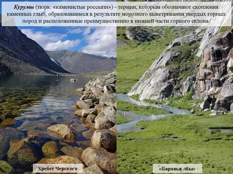 Слайд 20. В результате морозного выветривания твердых горных пород, слагающих хребты Восточной Сибири, образовались куруммы (тюрк. "каменистые россыпи") - скопления каменных остроугольных глыб, расположенных преимущественно в нижней части горного склона.