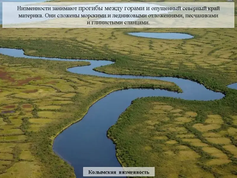 Слайд 21. Низменности занимают в Восточной Сибири прогибы между горами и возвышенностями (Вилюйская, Северо-Сибирская) или опущенный северный край материка (Яно-Индигирская, Колымская). Они сложены морскими и ледниковыми отложениями, песчаниками и глинистыми сланцами.