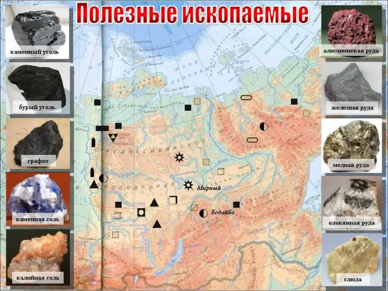Слайд 22. Состав полезных ископаемых определяется строением земной коры (работа с физической и тектонической картами). С выходами кристаллических пород фундамента связаны месторождения железных (Коршуновское и Нижнеангарское) и медно-никелевых руд (Талнахское). В тектонических прогибах находятся крупнейшие месторождения углей. Среди них самый большой угольный бассейн - Тунгусский. Угли разрабатываются на юге Якутии (Южно-Якутский бассейн) и Красноярского края (Канско-Ачинский бассейн). Территория угольных бассейнов обводится с помощью инструмента "фломастер".