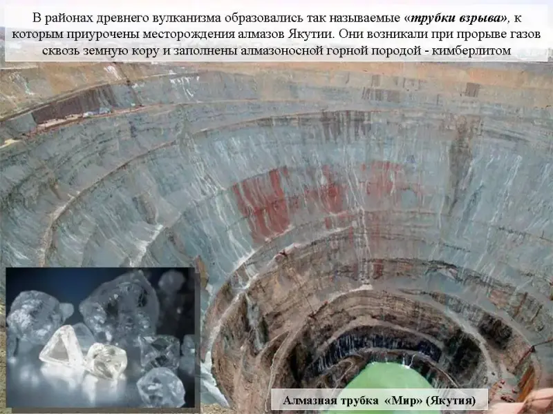 Слайд 23. В районах древнего вулканизма образовались так называемые "трубки взрыва", к которым приурочены месторождения алмазов Якутии. Они возникали при прорыве газов сквозь земную кору и заполнены алмазоносной горной породой - кимберлитом. Крупнейшая из них расположена в поселке Мирный (Якутия).