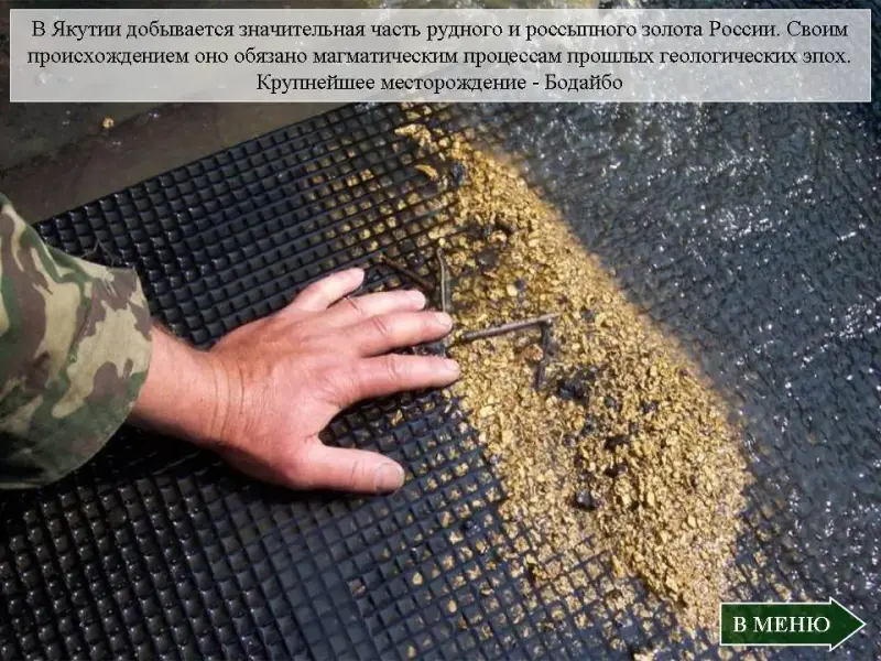 Слайд 24. В Якутии добывается значительная часть рудного и россыпного золота России. Своим происхождением оно обязано магматическим процессам прошлых геологических эпох.