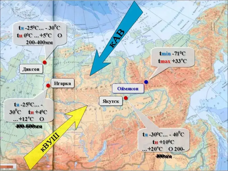 Для Северо-Восточной Сибири характерно явление температурной инверсии - повышения температуры с высотой. Вызывающие ее причины - котловинный рельеф и антициклональная погода.