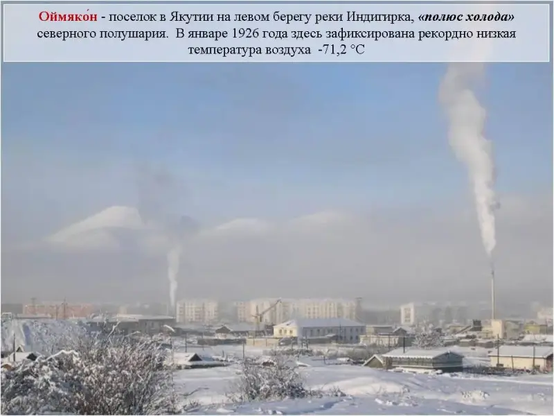 Слайд 26. Оймякомн - поселок в Якутии, на левом берегу реки Индигирка, "полюс холода" северного полушария. В январе 1926 года здесь зафиксирована рекордно низкая температура воздуха -71,2 °C. Зимой температура часто падает ниже -45 °С. Оймякон называют самым холодным "погребом" земного шара. Здесь в январе температура воздуха падает до -70 оС, мощность снега составляет 10-11 см, поэтому незащищенный грунт промораживается на большую глубину. Снег держится 230 дней, и около 40 дней температура воздуха поднимается выше нуля. При таких низких зимних температурах могут возникать трещины в почве.