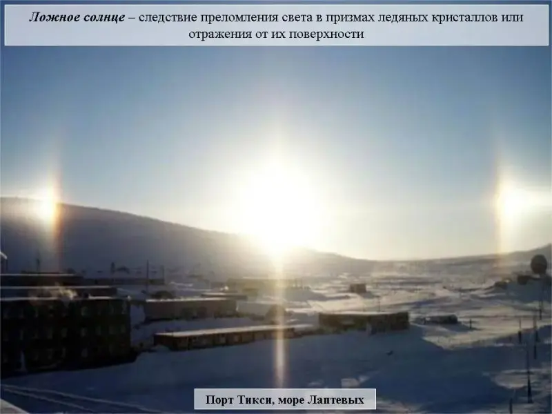 Слайд 27.Следствие морозной погоды - ложное солнце - возникает при преломлении света в призмах ледяных кристаллов или отражения от их поверхности.