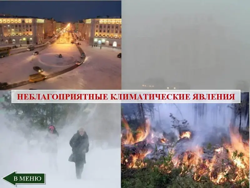 Слайд 28. Среди неблагоприятных климатических явлений дети называют метель, морозные туманы, жару и засуху на юге территории, полярную ночь.