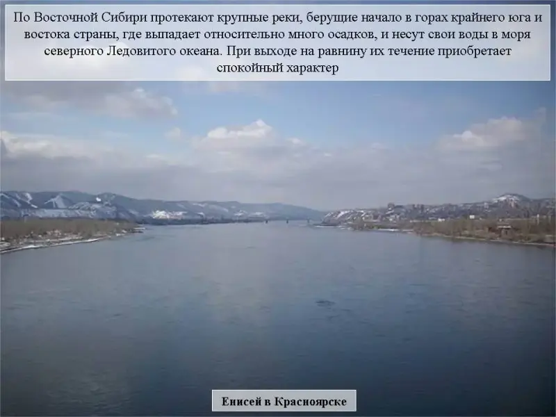 Слайд 29. По Восточной Сибири протекает ряд крупных рек (каких, определение по физической карте), берущие начало в горах крайнего юга и востока страны, где выпадает относительно много осадков, и несут свои воды в моря северного Ледовитого океана. В верховьях их течение бурное, при выходе на равнину оно приобретает спокойный характер.