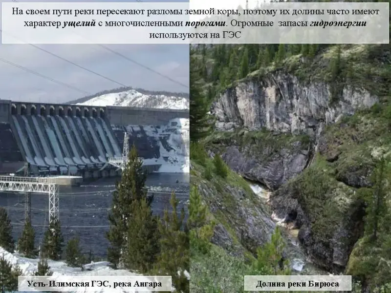 Слайд 30. На своем пути реки пересекают разломы земной коры, поэтому их долины часто имеют характер ущелий с многочисленными порогами. Огромные запасы гидроэнергии используются на ГЭС.