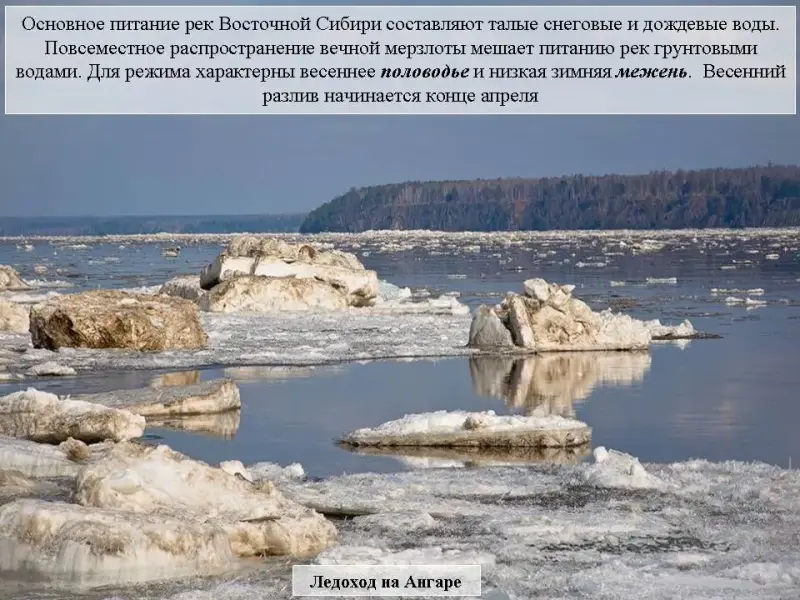 Слайд 31. Основное питание рек Восточной Сибири составляют талые снеговые и дождевые воды. Повсеместное распространение вечной мерзлоты мешает питанию рек грунтовыми водами. Для режима характерны весеннее половодье и зимняя межень. Ледостав начинается в низовьях с конца октября, а весенний разлив - в конце апреля.