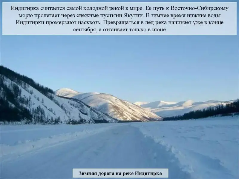 Слайд 32. Индигирка считается самой холодной рекой в мире. Ее путь к Восточно-Сибирскому морю пролегает через снежные пустыни Якутии. В зимнее время нижние воды Индигирки промерзают насквозь. Превращаться в лёд Индигирка начинает уже в конце сентября, а оттаивает только в июне.