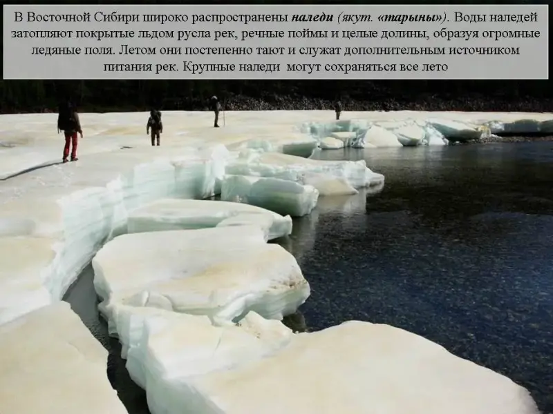 Слайд 33. Распространенным явлением, особенно в северной части Восточной Сибири, являются наледи - слоистые ледяные массивы на поверхности, образующиеся при замерзании периодически изливающихся вод и наиболее широко распространенные в области многолетнемёрзлых горных пород. Воды наледей затопляют покрытые льдом русла рек, речные поймы и целые долины, образуя огромные ледяные поля. Летом они постепенно тают и служат дополнительным источником питания рек. Крупные наледи могут сохраняться все лето.