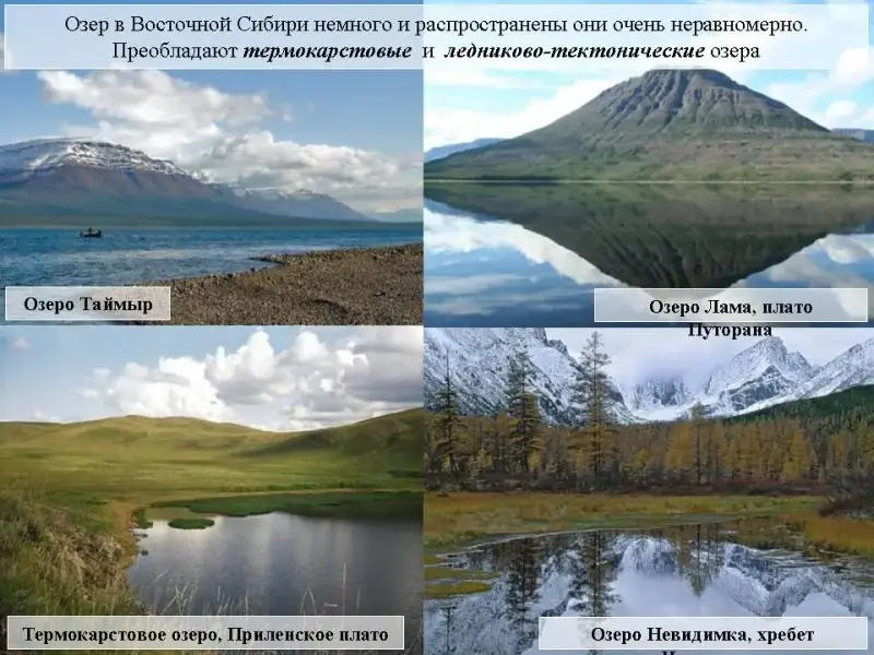 Слайд 34. Озер в Восточной Сибири немного и распространены они очень неравномерно. Преобладают термокарстовые и ледниково-тектонические озера.