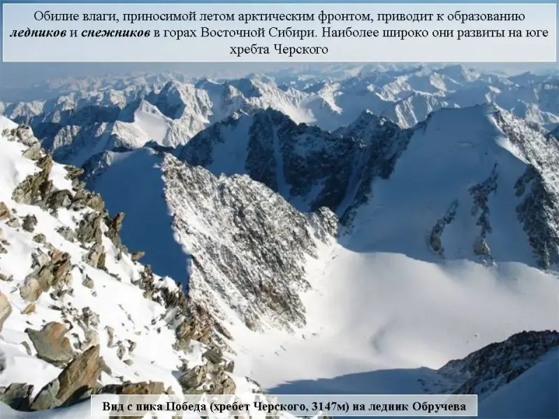 Слайд 35. Обилие влаги, приносимой летом арктическим фронтом, приводит к образованию ледников и снежников в горах Восточной Сибири. Наиболее широко они развиты на юге хребта Черского.