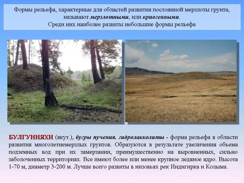 Булгунняхи (якут.), бугры пучения, гидролакколиты - форма рельефа в области развития многолетнемерзлых грунтов. Образуются в результате увеличения объема подземных вод при их замерзании, преимущественно на выровненных, сильно заболоченных территориях. Все имеют более или менее крупное ледяное ядро. Высота 1-70 м, диаметр 3-200 м. Лучше всего развиты в низовьях рек Индигирка и Колыма.