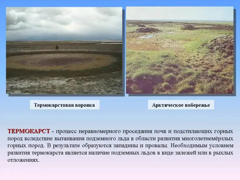Слайд 37. Термокарст - процесс неравномерного проседания почв и подстилающих горных пород вследствие вытаивания подземного льда в области развития многолетнемёрзлых горных пород. В результате образуются западины и провалы. Необходимым условием развития термокарста является наличие подземных льдов в виде залежей или в рыхлых отложениях.