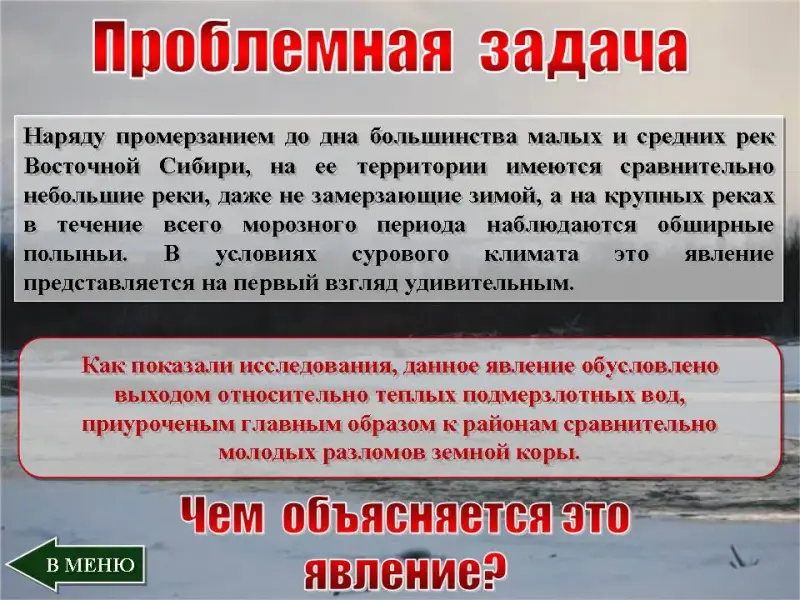 Учитель озвучивает текст: "Наряду промерзанием до дна большинства малых и средних рек Восточной Сибири, на ее территории имеются сравнительно небольшие реки, даже не замерзающие зимой, а на крупных реках в течение всего морозного периода наблюдаются обширные полыньи. В условиях сурового климата это явление представляется на первый взгляд удивительным. Чем объясняется это явление"?